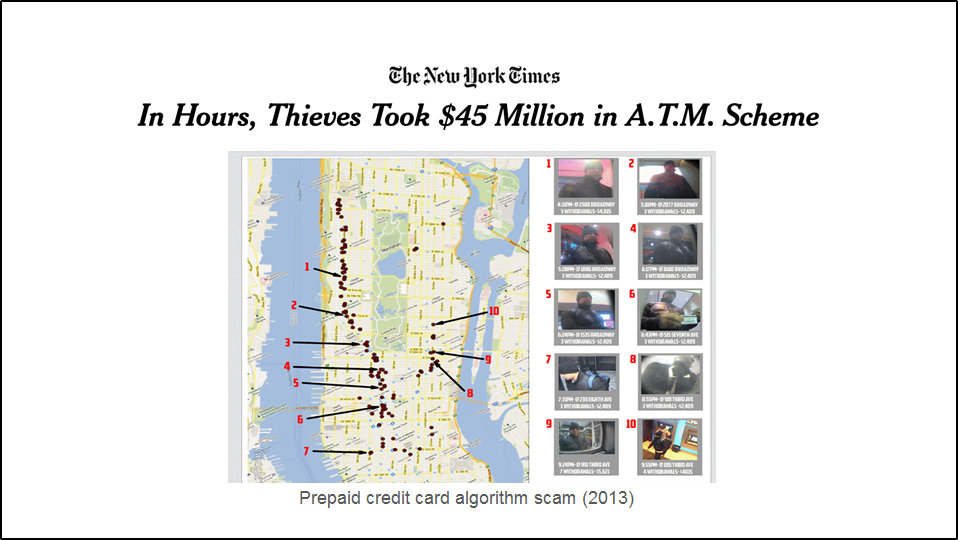 Another slide depicted the 2013 group ATM heist in NYC by $45M in a matter of hours: